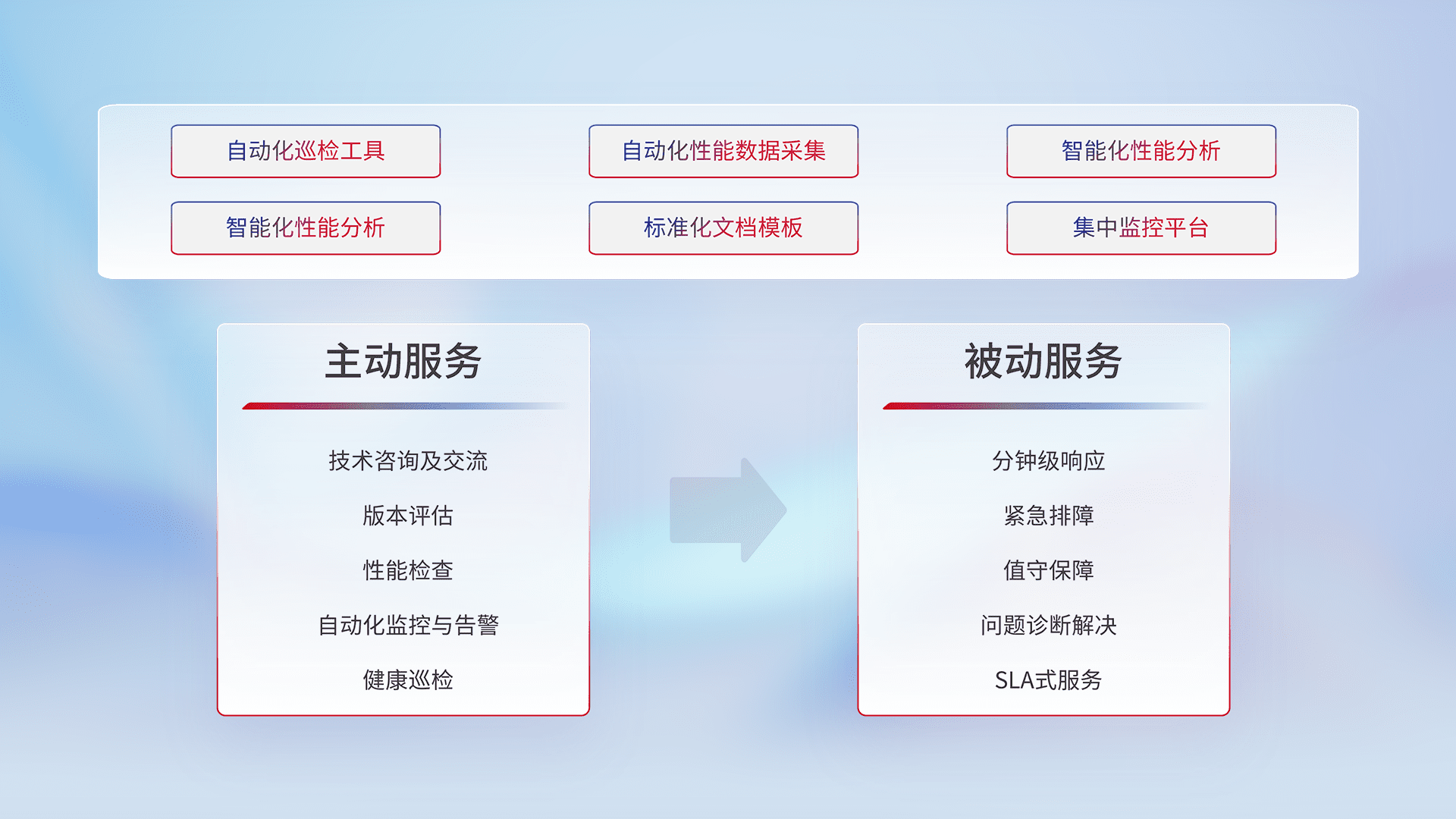 智能化工具和标准化文档,,,保障服务质量,,,提供主动服务(包含技术咨询、、、、版本评估、、性能检查、、、自动化监控与告警、、、、健康巡检)和被动服务包含(分钟级响应、、、紧急排障、、、值守保障、、问题诊断解决、、、SLA服务)。。